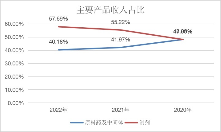 反应“集采”政策的政策推动华海药业营收结构疗养转型,以前三年,华海药业制剂类产物营收占比逐年走高,2022年制剂类产物一举超越原料药及中间体17个百分点成为第一营收孝安产物。